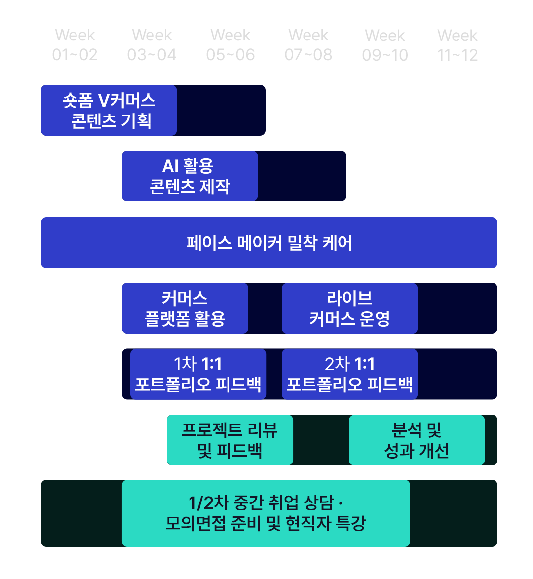 - AI 콘텐츠 제작, 커머스 플랫폼 활용, 라이브 커머스 운영까지 직접 경험해 볼 수 있습니다.
